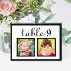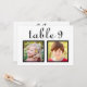 Modern and unique custom wedding table number cards feature childhood photos of the bride and groom at an age that corresponds with the table number. To customize: type in the table number, click "change" by the default photos to upload your own digital or scanned photos, and add that individual table number card to your shopping cart. Repeat for all of the table numbers that you need. Black script custom text on a white (can be customized) background color.