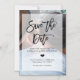 This modern and stylish wedding save the date magnetic card features your own photo covering the background completely. A sheer white overlay features trendy black script typography.