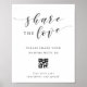Custom-designed wedding QR code sign featuring "Share the Love" black and white modern calligraphy design.