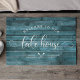 Modern, chic brush script reading WELCOME TO OUR LAKE HOUSE in a trendy typography driven design. Great custom lake house decor for your home away from home. Both romantic and stylish, our turquoise printed driftwood door mat features a sweet canoe illustration between your location and the year established.