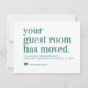 Your Guest Room Has Moved Moving Announcement featuring a modern script and font typography and a heart. The colors can be changed easily by clicking personalize and then click to customize further to view our color picker. Contact our shop if you require help.