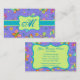 Make an impression with this stylish monogram business card. Beautiful whimsy butterflies dizzily fly about on this business card colorful personalized with your monogram initial. If you prefer your name instead of initial, delete the emblem and change the monogram to your name or other word on the turquoise teal bar that can be enlarged. The beautiful colors of lavender, fuchsia pink, turquoise blue, orange and yellow create a great color palette on a periwinkle lavender or purple background. The motif icon design elements also include yellow, turquoise, lavender and fuchsia pink flowers and whimsy circles. Customize for yourself or for a gift. Butterflies are always popular and good luck as well as trendy, contemporary and stylish with great appeal. Fully customizable to add your monogram or a name or other special word. Coordinate with other products in the same color in this store. Multiple color choices for background colors are also available in this store.