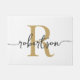 Girly Modern Elegant Stylish White and Gold Monogram Initial Family Name Script Custom Personalized Doormat. This design featuring a family name in a pretty hand lettered swash tail font calligraphy (or typography) with monogram initialin gold and black on white color background. Great stylish feminine housewarming gift, also for birthday, wedding, anniversary, bridal shower, newlyweds, bachelorette party and It’s for the girl wholikes clean minimalist things.