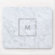 Custom-designed monogram mouse pad featuring modern white marble background design with personalized monogram enclosed in a silver glitter frame.