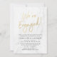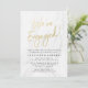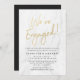 Stylish modern wedding engagement party invitations featuring a "We're Engaged" in a faux gold foil trendy script font, white marble background, and placeholders for your custom engagement party information. The back of the gold engagement party invites can be changed to a color of your choice with the Customize tool.