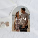 Arch-shaped acrylic save the date wedding announcement that features your photo overlayed with your monogram initials in large elegant white typography. Customize your save the date details in modern white lettering.