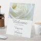 Elegant and modern white rose wedding pedestal sign. Text can be personalize for your wedding day or any type of celebration.