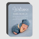 Modern, elegant white script photo birth announcement photo magnet featuring "Welcome" and baby's name and birth details in a modern sans serif typeface. This easy-to-customize baby photo magnet is a wonderful keepsake of your special, happy moment and a lovely gift for family and friends. © y.BEE PAPERIE #ZazzleMade #birthannouncement #babyannouncement #babyphotomagnet