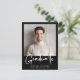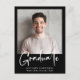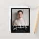 Modern black graduation announcement postcard with your photo and "Graduate" in a bold white script. Add the grad's name, school and class year in simple white typography. On the reverse side, add an additional photo and personalized message, or leave blank.