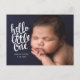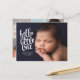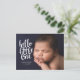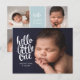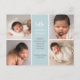 Modern birth announcement with one photo on the front and four on the back, accompanied by elegant white calligraphy script. All the colors can be customized. It can be personalized with your own message and baby stats.
