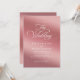 This Modern White Script Typography Rose Gold Wedding Invitation features clean white lettering on a smooth rose gold background. The design offers a stylish and elegant look suitable for any modern wedding theme. It is easy to personalize with names, dates, and event details. You can order it as a printed cards or digital download.