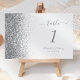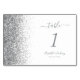 The left-hand edge of this elegant modern wedding table number features a silver faux glitter design. The customizable text combines gray handwriting, copperplate and italic fonts on a white background.