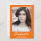 Elegant and simple photo announcement designed with trendy white handwritten brush script typography. Customize school or college details and class year. Personalize message in the back from proud parents. This design has added flourishing ornaments nestling the message, which can me eliminated if not needed.Customizable orange and blue background to match of graduates school.