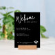 Modern minimalist pedestal sign welcoming guests with your wifi network and password information.