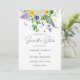 This is a lovely fresh and modern save the date invitation. The design features a variety of spring wildflowers including yellow daffodils, purple pansies, clovers, lavender, sweetpeas, dandelions, tulips and fern and ivy greenery. It also includes a few ladybirds, a sweet dragonfly and a message and photo on the back.