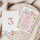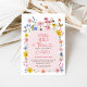 Young, wild and three themed third Birthday invitation for a girl featuring a pink arch, various colored wildflowers, butterflies and bee. This girl young, wild and three is ideal for a girl wildflowers themed third birthday party.