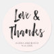These fresh and modern wedding stickers feature trendy handwritten black script that says "love and thanks" on a chic, blush pink background.