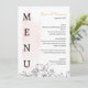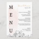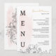 Impress your guests with this elegant wedding menu featuring a soft blush watercolor backdrop and refined black floral illustrations. The vertical “MENU” layout adds a modern, sophisticated touch, while the delicate design maintains a romantic and timeless feel. Perfect for any elegant, garden, or contemporary wedding theme, it completes your reception table styling with effortless beauty.
