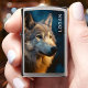 Modern, personalized Zippo Lighter with a close-up image of a wolf at sunrise, night sky in background.