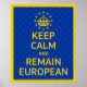 Decorate your room with this cool poster with this comforting "Keep Calm and Remain European" slogan. Yellow and blue Keep Calm with crown and European Union font in a vector image. The yellow and blue are the official colors of the European Union. As are the circle of yellow stars. The background is blue with a yellow border.