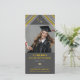A modern and trendy, gender neutral graduation announcement card design featuring preppy and gold, silver and yellow color themed diagonal stripes with a single photo and simple typography.