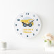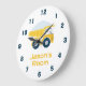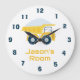 Sweet baby boy's dump truck themed nursery wall clock featuring yellow and black dump truck, black numbers and yellow name.