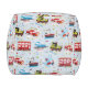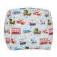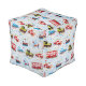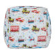 Buses, cars, planes, trains, boats and trucks in fun illustrated pattern on blue.