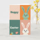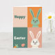 This card is divided into four neat squares that read as one friendly Easter scene 🐰. In the top-left square, the word “Happy” sits centered in rounded lettering on a soft peach background. The top-right square shows the upper body and long ears of a mint-green bunny with wide dark eyes and a small smile, set on a bright orange field, as if it’s leaning in to greet someone. In the bottom-left square, “Easter” appears in white lettering on a deep teal background, with the tip of an orange carrot and a patterned pink egg shape tucked in as accents 🌷. The bottom-right square features a white bunny with the same gentle grin on a muted rose-pink background, angled like it’s sharing the moment with its neighbor. Together, the two bunnies feel like friendly companions, their matching expressions and mirrored placement suggesting a sweet, shared glance across the grid. The peach, orange, teal, and rose-pink squares form a balanced layout with flat shapes and crisp edges.