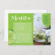 Recipe postcard for the Mojito, a traditional Cuban highball cocktail drink made with rum, mint, and lime. The card includes a photo of a bottle pouring into a glass with mint and lime, graphics of lime slice and mint leaf, and the recipe.