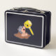 This is a standard metal lunchbox that appears to work just fine. We designed this box ourselves with an uploaded photo and custom text on the front and back. It looks absolutely beautiful except the front of the lunchbox is not centered like it shows in the photo. The print borders don't align with the inset flat part of the box where the preview photo online showed it perfectly centered in there. The back looks nice and centered though.