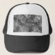 Trucker hat with a cool "liquid metal look" abstract design, and swirling, bubbling shapes in shades of silver grey. Can be used as a background for your own text, images and ideas. Please note this is a printed digital art image, it does not shine or contain real metal.