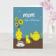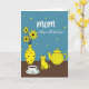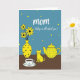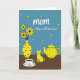 Designed with a sunny yellow and calm teal-blue palette, the illustration sets a cozy tabletop scene that feels like a quiet thank-you shared between close hearts ❤️. On a rich brown surface, a tall oval vase with small black polka dots stands on the left, holding three golden flowers with dark centers and slim stems. Beside it, a bright yellow cat curls in with eyes gently closed, its relaxed whiskers and soft posture suggesting trust and comfort. To the right sits a round yellow teapot decorated with a lime-green grid, like it’s ready for an unhurried chat with someone dear. In front of the teapot, a white teacup filled with dark tea rests on a matching saucer, both trimmed with small green floral accents 🌼. Near the top, the message “mom today is all about you!” appears in white lettering against the teal background, centered above the objects for easy reading. The teal backdrop is sprinkled with small yellow dots that echo the flowers and teapot, floating lightly above the scene.