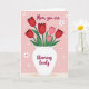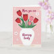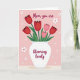 On the front of the card, a white vase sits centered like a calm anchor, holding a bouquet of spring flowers that lean toward each other the way close friends do ❤️. Deep red blooms with slightly cupped petals sit among softer pink flowers, creating a gentle contrast that feels affectionate rather than formal. Green stems and leaves rise in loose curves, giving the arrangement an easy, natural flow. The background is blush pink, setting a tender, cozy scene without distracting from the flowers. Small white daisy shapes are scattered around, each with a tiny red center, like little nods of attention sprinkled across the space 🌼. Near the top, the words “Mom you are” appear in dark burgundy lettering, centered above the bouquet. Below the vase, “blooming lovely” continues in the same dark burgundy, aligned to follow the base and balance the layout. The petals show soft shading, and the vase has smooth, rounded edges against the pink field.