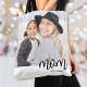 Simple Mom Personalized Tote Bag. Celebrate motherhood with this minimalist design featuring the word “mom” in a lowercase serif font across the bottom right for a warm and playful look. A white band runs along the bottom, where the text overlaps between the white and the photo for a clean, modern touch. You can add a personalized “est. year” to make it special for a mom-to-be, a new mother, or to celebrate mom any time. The design is printed on both sides, and you can include up to 3 years or shorten them (like 23' 24' 25'). Perfect for Mother’s Day or everyday use, this simple and timeless tote honors mom in style.