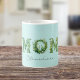 Beautiful mugs for moms features watercolor floral greenery letters that spell out M-O-M in with customizable "extraordinaire" in modern script, on pastel blue background