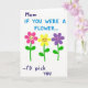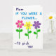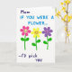 The front design shows a white background with a simple, childlike drawing style that feels sweet and friendly ❤️. Across the top, the text reads “Mom IF YOU WERE A FLOWER…” with “Mom” in deep indigo and the rest in a light sky blue, spaced evenly like a headline. Near the bottom, the line “…I’D pick YOU” sits as a closing phrase, using matching cool-toned lettering that stands out clearly against the white. Centered between the two lines are three smiling flower characters standing side by side, giving the scene a cozy, togetherness feel like close friends leaning in for a photo. The blossoms are colored fuchsia, sunny yellow, and soft lavender, each with rounded petals and a circular face showing closed eyes, a wide grin, and tiny pink cheek dots 🌼. Thin green stems drop straight down with two small leaf shapes on each, keeping the arrangement tidy and balanced. The three flowers are aligned in a neat horizontal row, with their bright petals and green stems forming the main focal band in the middle of the card.