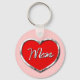 This key chain shows an engraved, chrome-ringed heart with the word "Mom" in the center.