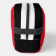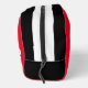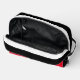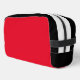 Whether you're traveling by air or car, this bag will make great First Aid Kit. The interior compartment is fully lined, with two mesh pockets, one zippered and one elastic. This bag also has a convenient carry-handle that doubles as a hanging strap. The front and back panels are red, and the top and sides are black with stripes. The word "Mom’s” can be personalized.