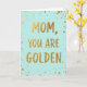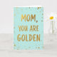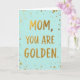 This greeting card features the message “MOM, YOU ARE GOLDEN” in textured gold lettering set against a calm aquamarine background. The words are arranged in three stacked lines and centered on the front, giving the message a steady, affectionate focus ❤️. Each letter has a slightly uneven, brush-like edge that makes the gold feel warm and intimate, like a note written with extra care. The aquamarine field stays smooth and airy, letting the gold stand out like a gentle glow without feeling harsh. Around the text, tiny gold speckles scatter across the design, creating a soft celebratory sparkle that feels like a quiet shower of confetti 🌼. The speckles vary in size and density, with lighter dustings in some areas and thicker clusters in others, adding movement while keeping the layout simple. The gold flecks drift across the aquamarine space from edge to edge, framing the centered message with a shimmering, stardust-like texture.
