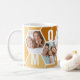 Honeycomb coffee mug, personalized with 5 of your favorite photos and printed with a 5 letter name, such as MOMMY. The design features a honeycomb photo collage in shades of cream beige honey and burnt orange. If you want to change the colors, click "customize further" and click each hexagon that you want to change.