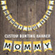 Easily customize Theme Parties' 🐝 Mommy To Bee bunting banner for any 16-letter phrase, and let our sweet bumble bees display your message at your event, whether it's a baby shower, welcome home, or other party-worthy occasion. The design features watercolor bumble bees and daisies and matching honeycomb pattern. #BabyShower #GenderNeutral #BeeTheme