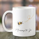 This coffee mug is decorated with watercolor honey bees and "Mommy to Bee" in stylish script typography.