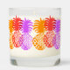 Warm colorway of Citrus Yellow, Tangerine, Hibiscus Red and Violet. Momona means sweet-tasting in Hawaiian. And these stamped graphical pineapples are just that! The front of the candle says "Aloha" . This design comes in several colorways.