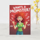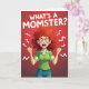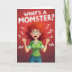 This card shows a stylized woman caught mid-outburst, her reddish-brown hair flaring outward like a stormy halo around her head. Her green eyes are wide, brows pulled tight, and her mouth is open with teeth showing, as if she’s letting out a silent shout while still trying to hold it together ❤️. She stands in a casual green collared shirt and blue jeans, fists clenched at her sides, with a faint pink flush on her cheeks that hints at stress boiling over. The background is a hot red gradient that feels like rising heat, and sharp white zigzag lines burst from around her head like jolts of pressure. At the top, large white all-caps text asks, “WHAT’S A MOMSTER?” with the words centered and spaced to stand out against the red. The humor lands like a knowing glance between friends 🌼, turning the intense expression into something relatable rather than scary. White jagged marks radiate outward in several directions, framing her hair and face against the fiery backdrop.