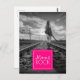 This postcard exudes a very cool vibe with a black and white photo of a woman with a guitar slung over her back walking railway tracks contrasting against the white "MOMs ROCK" wordmark on bright pink.