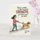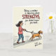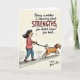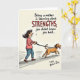 This card shows a light cream background with a lively illustration that captures a close, everyday bond between a woman and her eager dog ❤️. Across the upper area, a large message reads, “Being a mother is learning about STRENGTHS you didn’t know you had…,” with “STRENGTHS” set in bright red while the rest of the line appears in darker lettering. Below the text, a brown-haired woman in a soft pink top and blue trousers leans back with an open mouth and a determined posture, as if she’s calling out while trying not to lose her footing. She grips a leash tightly, and the dog—medium-sized with warm brown fur—lunges forward with its tongue out and tail up, like it can’t wait to lead the way. Motion lines around them add a sense of speed, and the tug between them reads like affectionate teamwork rather than frustration. Near the bottom, a smaller message says “happy Mother’s Day” in a gentle, darker tone, tucked beneath the action like a quiet note 🌼. The dog is drawn bounding ahead at a slight angle, with curved motion marks trailing behind its paws.