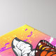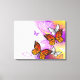 Orange, detailed monarch butterflies on light, purple, picturesque, painted background.