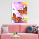 Orange, detailed monarch butterflies on light, purple, picturesque, painted background.