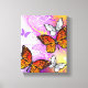 Orange, detailed monarch butterflies on light, purple, picturesque, painted background.