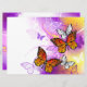 Orange, detailed monarch butterflies on light, purple, picturesque, painted background.